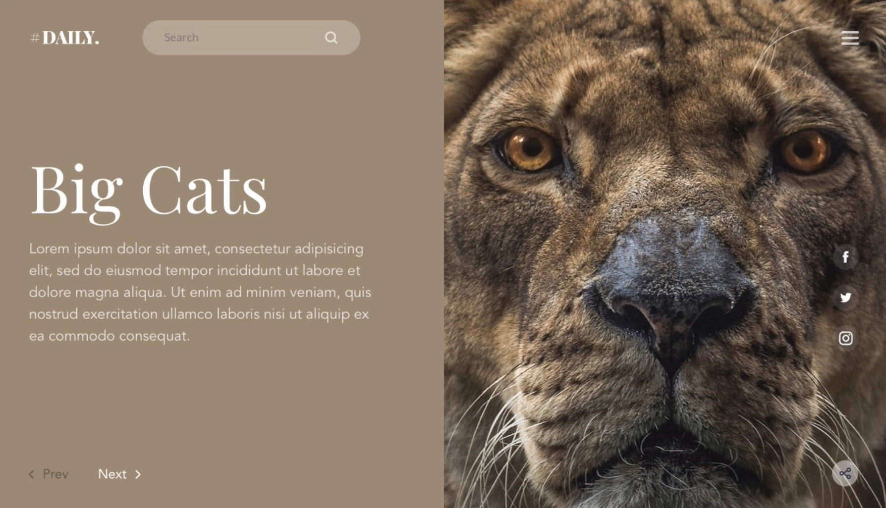 색상을 적용한 왼편의 텍스트와 배경이 오른편의 사자 사진과 맞물려 조화롭게 잘 어울립니다.