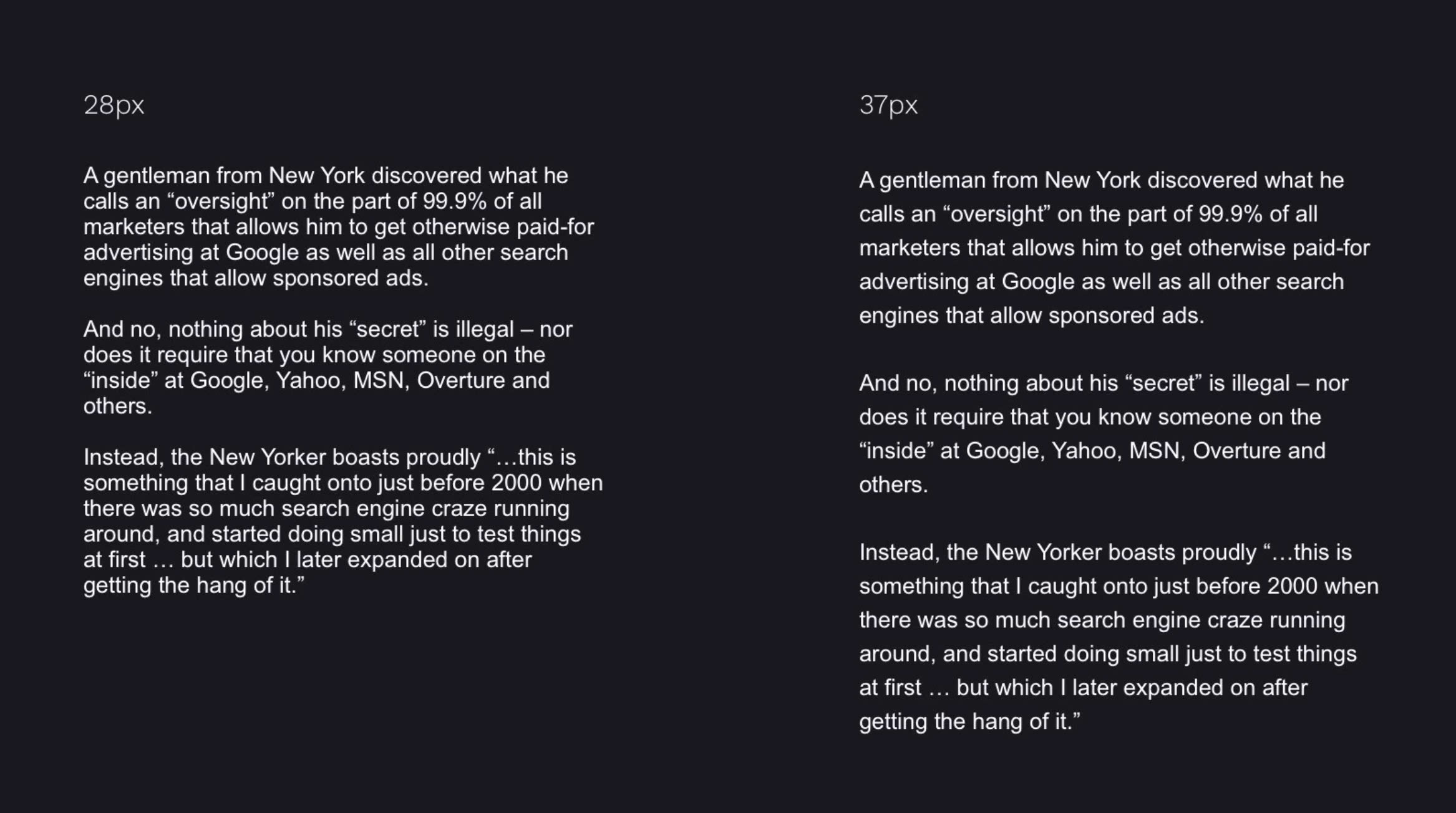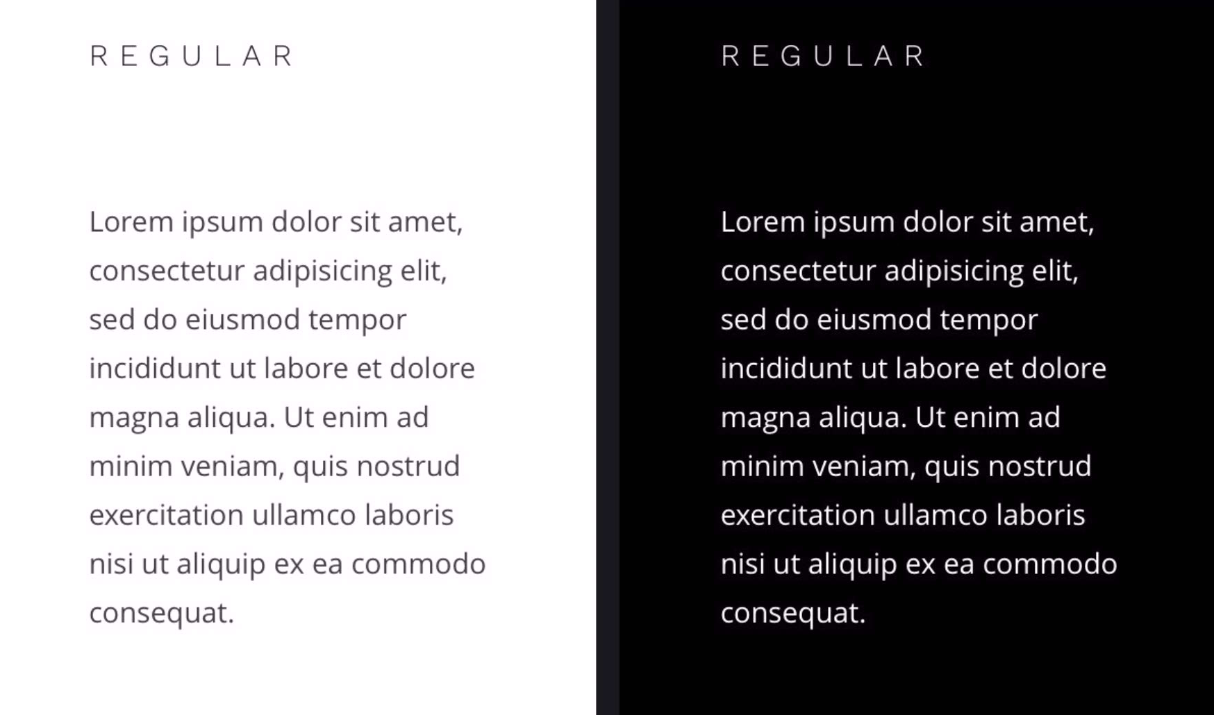 이런 착시현상을 보정하려면 Regular 보다 더 얇은 두께의 텍스트를 사용하는게 좋습니다.
